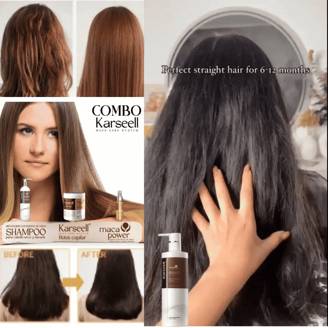 El Combo Karseell es un tratamiento capilar completo que incluye shampoo, acondicionador y mascarilla de colágeno, formulado para reparar profundamente el cabello maltratado y devolverle toda su vitalidad. Gracias a ingredientes como el colágeno, aceite de argán y queratina, este combo hidrata, nutre y fortalece desde la raíz hasta las puntas.